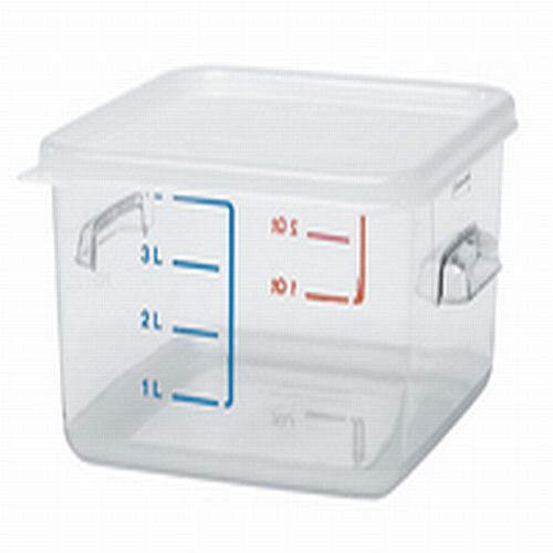 Container, Space-Saving; Rubbermaid; Clear polycarbonate; Snap mechanism around perimeter; Graduated; Smooth interior; Textured bottom; Pocket-style handles; 4 qt. (3.8L); L x W x H: 8-3/4 x 8-5/16 x 4-23/32 in. (22.2 x 21.1 x 12.0cm)